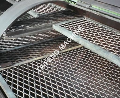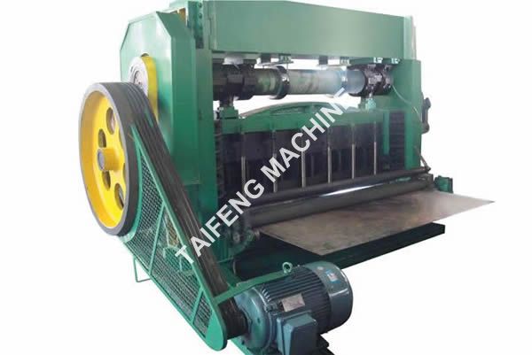 The expanded metal mesh machine is composed of machine frame, sidewall plate, top plate, drive motor, V type belt wheel transmission mechanism, clutch device, crankshaft Connecting rod system, sliding block, up and down blade and tool holder, material feeding and moving device, lubrication system and electric system.