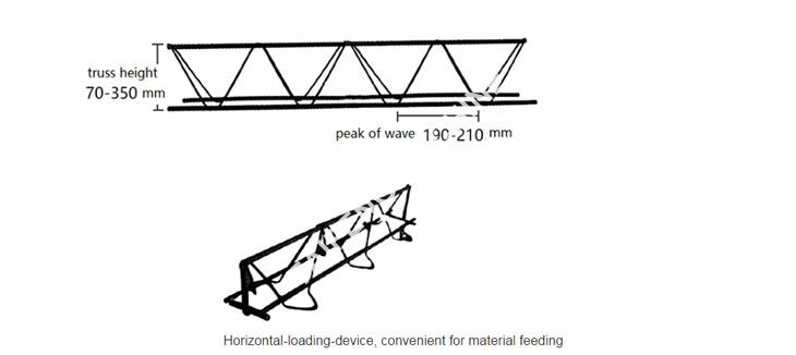 3D trussgirder is up-to-date rebar design used in modern building construction. 3Dtruss girder will be assembled with roll formed steel deck to be as combinedtemplate for site pouring. This kind of construction method reduces too muchsite rebar binding works, raises working efficiency and shortened constructionperiod. Stress mode of truss girder is reasonable and so provides larger steeldeck rigidity, usually no need temporary support.